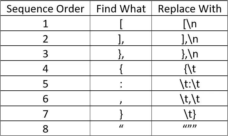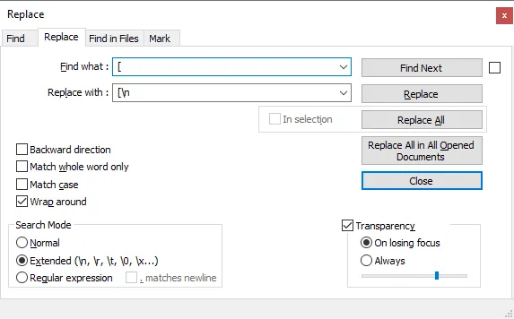 Repeat the same procedures for each items below. Make sure to do them sequentially. If you follow this guide for first time, the first item is done just previously, which is Find [ and replace with [\n.